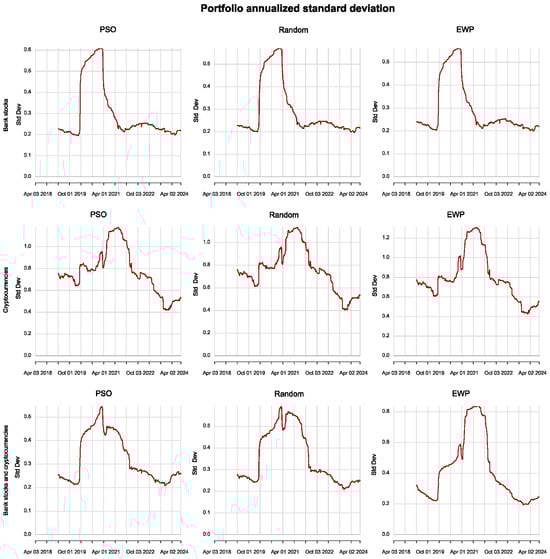 The dynamic annualized standard deviation metrics in Figure 9 show that for all methods, the portfolio of bank stock-only was very risky in the first six months of 2020, after which there was a great decline in portfolio risk until the beginning of 2022. The cryptocurrency-only portfolio experienced great risk uncertainty for all optimization methods. However, risk has been declining since the beginning of 2022. The portfolio of cryptocurrencies and bank stocks has a risk profile that replicates that of cryptocurrencies more for all methods. Similar to the Sharpe ratios, this is observed more in the EWP compared with the PSO and Random portfolios. The EWP portfolio, however, recorded the biggest decline in portfolio risk in the first six months of 2020. This could, however, be due to an underestimation of the portfolio risk during this period.