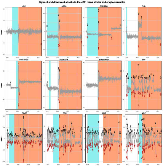 Streaks in Figure 10 show that the JSE index was more stable compared with bank stocks and cryptocurrencies. Among bank stocks, negative streaks show that FNB, Nedbank, and Standard Bank performed better than Capitec Bank and Investec, with lower downward streak losses during the first six months of 2020 when the COVID-19 crisis was at its peak. However, Absa bank stock returns were more volatile during this period, although with comparable losses to those of FNB, Nedbank, and Standard Bank. Among cryptocurrencies, Ethereum, Dogecoin, and Monero performed better than Bitcoin and Ripple, with lower downward streak losses during the first six months of 2020. However, after three months of this six-month period, Monero remained in a downward streak, and Ethereum moved into an upward streak, with Monero and Dogecoin being very volatile. Whereas the post-COVID-19 period has posed challenges in picking stocks for the portfolio, for investors that prefer a shorter investment horizon, the most resilient asset combination during the first six months of 2020 should have included the JSE index, FNB, Nedbank, Standard Bank, and Ethereum, as these are upward streaking stocks but long-term investors may pick downward streaking stocks in anticipation of a price reversal and gaining from buying low and selling high (see Klos et al. 2023). Bitcoin, which has received much attention in the literature, when included, would have lowered the performance of the portfolio. Outside the first six months of 2020, the extended current period shows a reversal, with Capitec Bank and Investec recording upward streaks while FNB and Nedbank recorded downward streaks. Standard Bank remains the most adaptable and continues to streak upwards. Thus, the best combination during the current and extended post-COVID-19 period may include the JSE index and bank stocks, including Standard Bank, Investec, and Capitec Bank. The addition of cryptocurrencies to the portfolio during this period would lower the portfolio performance.