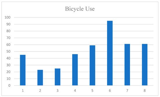 Frequency of bicycle use. Note: Numbers 1 to 8 indicate the number of times the respondent rode a bicycle. 1. A few times a year. 2. A few times every six months. 3. Once a month. 4. A few times a month. 5. Once a week. 6. A few times a week. 7. Four or five times a week. 8. Almost every day (six or seven times a week).