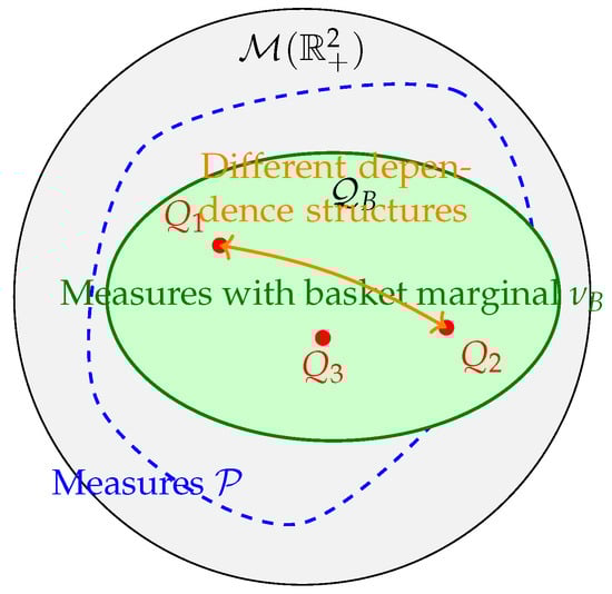 Let denote the set of all equivalent probability measures for the model that are consistent with no-arbitrage conditions. Here “equivalent” means the measures are mutually absolutely continuous (share the same null sets), ensuring meaningful probabilistic comparison. For practical risk-neutral pricing, these measures can be required to satisfy additional martingale constraints, though such requirements involve further mathematical complexity via optimal transport methods (; ; ). For any , let denote the joint probability distribution of the terminal asset prices under Q.