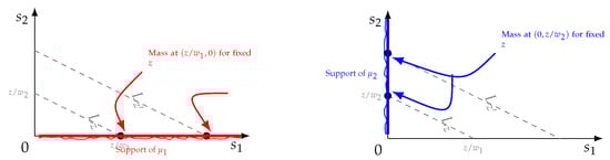 - Basket Consistency: For any measurable set A, the probability of the basket value being in A is . For both and , all the constructed mass for a given basket value z lies on the line where . The total conditional mass on is for , and for . Integrating over all z with respect to shows that both measures reproduce as the distribution of the basket variable.