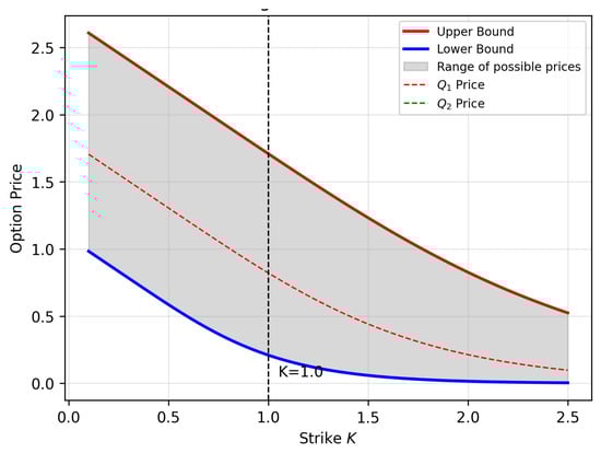 The bounds and represent theoretical extremes. The upper bound is achieved by non-equivalent measures (Dirac masses concentrated on the axes), while the lower bound corresponds to a measure where all mass lies on the line . Equivalent measures, such as those constructed in Theorem 4, yield prices strictly within the interval , with the exact position determined by the parameter . This demonstrates that equivalence constraints reduce but do not eliminate fundamental model uncertainty.