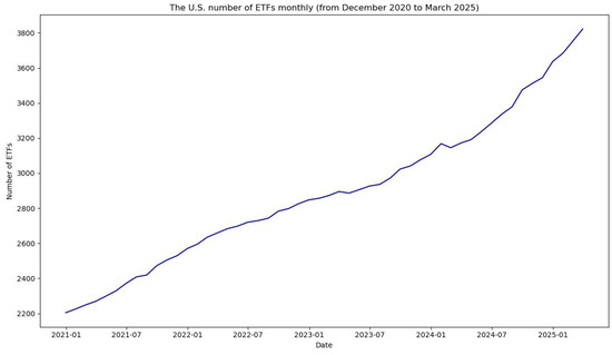 In this research, U.S. ETFs are investigated. The list of all U.S. ETFs traded in the USA that are currently tagged by the ETF Database is available from the (VettaFi 2025) website. However, the list may not contain newly issued ETFs, since the number of U.S. ETFs is still growing. Figure 1 visualizes the rapid growth in the number of the ETFs om the U.S. financial market during the period from 31 December 2020 (2204 ETFs) to 31 March 2025 (3822 ETFs) based on (YCHARTS 2025).