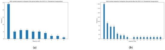 Symbol-sequence histograms for the AGG fund (based on Table 4). (a) The minimal number of sequences with non-zero frequency (10/27) within the period before the 2025 U.S. Presidential Inauguration. (b) The maximal number of sequences with non-zero frequency (17/27) within the period after the 2025 U.S. Presidential Inauguration.
