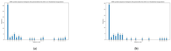 The most similar symbol-sequence histograms with minimal values of both Euclidean and Manhattan distances for the IEMG fund (based on Table 6). (a) The IEMG symbol-sequence histogram within the period before the 2025 U.S. Presidential Inauguration. (b) The IEMG symbol-sequence histogram within the period after the 2025 U.S. Presidential Inauguration.