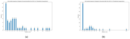 The least similar symbol-sequence histograms with the maximal value of the Euclidean distance for the XLK fund (based on Table 6). (a) The XLK symbol-sequence histogram within the period before the 2025 U.S. Presidential Inauguration. (b) The XLK symbol-sequence histogram within the period after the 2025 U.S. Presidential Inauguration.