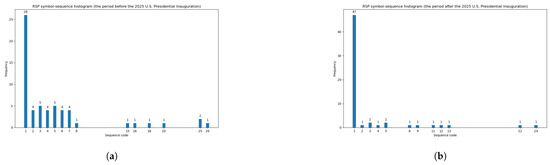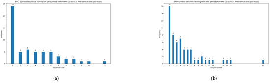 Symbol-sequence histograms that visualize the entropy increase (equal to 0.03) for the BND fund (based on Table 7). (a) The BND symbol-sequence histogram within the period before the 2025 U.S. Presidential Inauguration. (b) The BND symbol-sequence histogram within the period after the 2025 U.S. Presidential Inauguration.