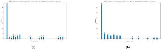 Symbol-sequence histograms that visualize the minimal entropy decrease (equal to −0.006) for the VWO fund (based on Table 7). (a) The VWO symbol-sequence histogram within the period before the 2025 U.S. Presidential Inauguration. (b) The VWO symbol-sequence histogram within the period after the 2025 U.S. Presidential Inauguration.