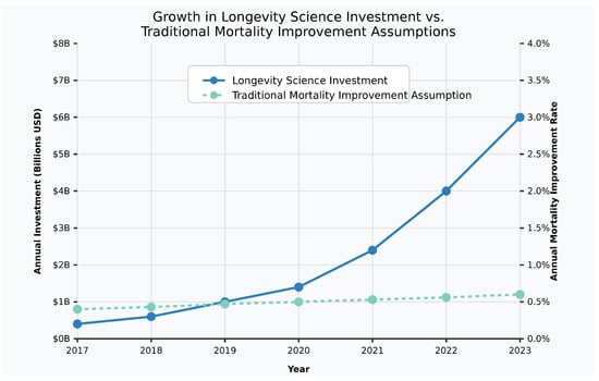 Growth in longevity science investments vs. traditional mortality improvement assumptions, 2017–2023. [Figure showing exponential growth in longevity investment compared to linear traditional mortality assumptions].