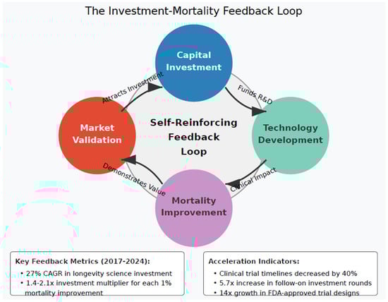 A critical dynamic emerges from this investment landscape: capital allocation creates a self-reinforcing feedback loop with mortality improvements. Initial investment leads to technological progress, which demonstrates mortality benefits, which attracts additional investment. This accelerating cycle fundamentally challenges the linear extrapolation methods typically employed in actuarial science. This is illustrated in Figure 2.