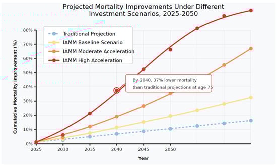 These effects produce mortality improvements that exceed traditional projections by 18–31% by 2040 (95% confidence interval: 12–37%), with the differential increasing over time.