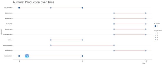 Figure 3. It highlights patterns of sustained and emerging contributions to the field. In particular, Holzinger A. and Kieseberg P. stand out as key figures, with publications spanning multiple years and a relatively high citation impact (as indicated by the darker circles and larger size representing total citations per year). In contrast, other authors—including Bertaina S., Biganzoli I., and De Silva D.—appear to be more recent contributors, with publications concentrated in 2023 and 2024, indicating a growing scholarly interest in the topic. Overall, the data suggest that while the field is attracting new contributors, a core group of authors is consistently shaping the dialogue through ongoing research output.