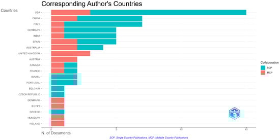 Figure 4 shows the distribution of research contributions by country of origin. It reveals a strong international engagement in the literature related to AI risks. The United States leads in the total number of publications, primarily through Single Country Publications (SCPs), indicating a high volume of domestically conducted research. In contrast, countries such as China, Italy, Germany, and India also show a significant research output, but with a more balanced mix of SCPs and Multiple Country Publications (MCPs), suggesting a stronger orientation toward international collaboration. Countries like France, Canada, and Israel demonstrate a higher proportion of MCPs relative to their overall output, while countries like Belgium and Portugal appear exclusively in MCPs. This distribution highlights both the dominant national research hubs and the critical role of international cooperation in shaping the discourse on emerging risks and technological development.