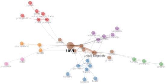 Figure 5 depicts the global collaboration network among the countries of the authors. In this network, nodes represent individual countries, while edges denote co-authored publications involving researchers from the connected countries. The size of each node is proportional to the total number of publications produced by authors from that country, and the thickness of each edge reflects the frequency of collaborations between the respective countries. Consistent with expectations, the United States and the United Kingdom appear as prominent central nodes, indicating their leading roles in AI risk research. Additionally, several other clusters emerge, forming significant hubs of research activity characterized by both domestic and international collaborative efforts. This visualization effectively illustrates the geographic distribution and interconnected nature of the global AI risk research community.
