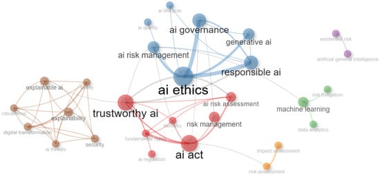 Figure 7 visualizes the relationships between keywords that frequently co-occur in the same publications. It shows that the keywords with stronger co-occurrence links are connected by thicker edges, and those that are conceptually related tend to form clusters. Larger nodes represent keywords that appear more frequently in the dataset. This analysis reveals several critical insights into the thematic structure of discussions on AI risk. We see that