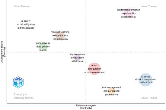This map provides a strategic overview of the conceptual structure of AI risk research by organizing keyword clusters based on their interconnections and development stages. The analysis was conducted on the 250 most frequent author keywords extracted from the Scopus dataset, after applying a two-step pre-processing procedure coherently with the analysis presented in the section about keywords: (i) the removal of the general search terms used to construct the corpus; (ii) synonymous or closely related terms were grouped manually to ensure semantic consistency across variations, keeping related but distinct terms as separate entities when they appeared with different co-occurrence patterns or thematic associations.