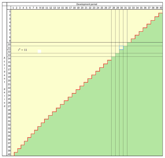 Case III: . In this case , which means that past development has passed through the first of the “abnormal” development periods, , but not the second, +1. It may be noted that the merged cell is incomplete, since the unmerged cell lies in the future. It also follows from (58) that , which corresponds with .