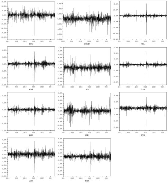 The sample period spans from 1 January 2014 to 31 December 2024, and we employ daily log returns as the primary variable of analysis. Relative to weekly or monthly data, daily log returns offer higher frequency and information density, which facilitates a more precise characterization of price volatility and its dynamic evolution. Equation (1) presents the method used to compute daily log returns: