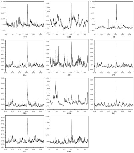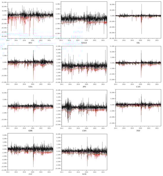 This study further constructs AR–EGARCH models to estimate and analyze the characteristics of volatility. Table 5 presents the estimation results of the AR–EGARCH models for each asset. The α coefficients are statistically significant at the 1% level across all assets, indicating that volatility in these markets is responsive to new information. Similarly, the β coefficients are also significant at the 1% level for all assets, suggesting that volatility exhibits persistence and is influenced by its own past values. Moreover, in all cases, the β coefficients are substantially larger than the α coefficients, implying that historical volatility exerts a stronger influence on current volatility than the impact of new shocks. This highlights that the dynamic evolution of asset volatility is primarily driven by past volatility patterns.