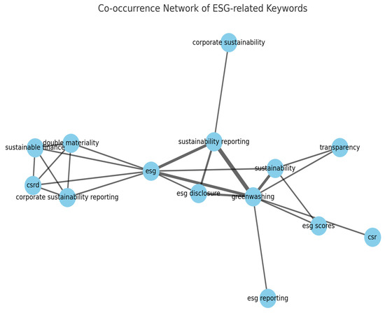 Figure 1 presents the co-occurrence network of keywords, showing strong conceptual linkages between “greenwashing”, “sustainability reporting”, and “ESG disclosure”. The density of edges indicated frequent co-mentioning of these terms, suggesting their conceptual interdependence in the current ESG literature.