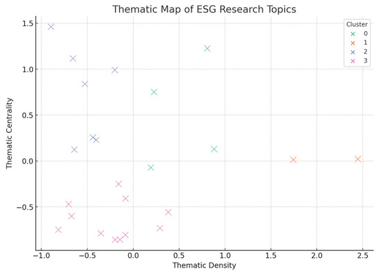 Thematic map of ESG research clusters derived from keyword density and centrality.