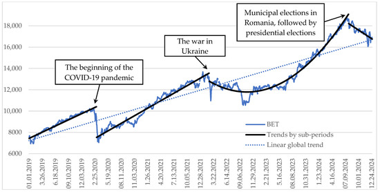 BET index, 2019–2024. Source: EViews 12 calculations, based on BVB data. Note: breakpoints of the time series, visible in the figure (i.e., 8 March 2020, 24 February 2022, 1 August 2024), were confirmed by the Chow Breakpoint Test.