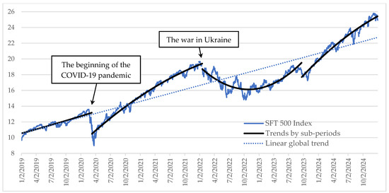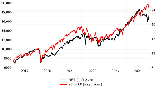 Throughout this research, SFT-500 refers to the SFT Index 500 Fund—Class 2 (a mutual fund tracking the S&P 500 index). The choice of this proxy instead of the official S&P 500 index is based on two considerations. First, the SFT-500 fund’s price level is similar to that of the BET index, which facilitates direct graphical comparison and interpretation of results without additional scaling transformations. Second, the Class 2 fund provides a more stable and complete daily data series for 2019–2024 than the official S&P 500 (or the Class 1 fund), ensuring consistency in our sample. In practice, the SFT-500’s returns move in lockstep with the S&P 500’s returns. Thus, using this fund does not alter the substantive results; it simply improves data comparability.