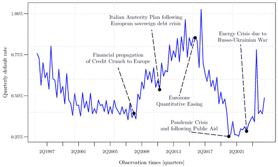 Finally, these time series are empirically driven by exogenous events over time. Some of the most relevant economic and political events that have affected Italy in recent decades are displayed in Figure 2, together with their effects on the observed default rates across all the economic sectors. Each sector has reacted differently to each of those events. Nonetheless, by examining Figure 2, it is easily verified that these events have a dramatic effect in general, including trend inversion phenomena.