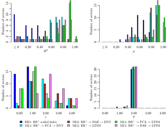 The six forecasting strategies outlined in Table 1 are compared to each other based on their fitness to each of the 32 considered (future) default rate time series introduced in Section 3.1 and Appendix A. Four quality-of-fitness indicators are utilized in the analysis: the coefficient of determination , the Pearson correlation coefficient , and the backward-shift indicators and introduced in Equations (22) and (23). Each of them is used to compare the forecast and the actual target value . The resulting quality distributions across all the economic sectors are displayed in Figure 3. The ideal model (i.e., ) should achieve .