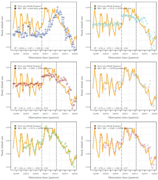 Figure 3 provides a clear picture of how well each strategy performs over the Italian default rate dataset compared with the others. As expected, RR1 exhibits the worst and distributions, consistent with the fact that no ML technique is involved in enhancing the quality of fit. In general, LSTM-based architectures (i.e., ML3, ML4, and ML5) perform better than DNN-based architectures (i.e., ML1 and ML2), in good agreement with the intuition that a more flexible neural network, with a memory function explicitly designed for time-series forecasting applications, in a suitable applicative context should achieve better results than a general-purpose neural network. Conversely, PCA-based architectures (i.e., ML1 and ML4) perform generally better than DAE-based architectures (i.e., ML2 and ML5). In cases where a linear compression of the information explains almost all the variance in data (5-factor PCA always achieved a fraction of explained variance greater than 99%), the training of a DAE may be a hard problem, with occasionally poor convergence, without a real benefit in terms of greater explained variance. All the considerations above are generally valid for the considered case study. Nonetheless, occasional exceptions may be possible depending on the specific sector.