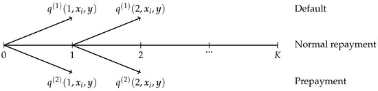 Assumption 2 means that the loss probabilities of the ith loan are fully determined by the individual factors and systematic factors . Given , the repayment behavior of the ith loan is illustrated in Figure 1. At each time , the ith loan is exposed to the default risk and prepayment risk, with the probability of default and the probability of prepayment. Although the actual loss values are not uniquely determined by the individual factors and systematic factors , the first and second moments of the loss distribution (equivalently, its expectation and variance) are fully specified by these factors.