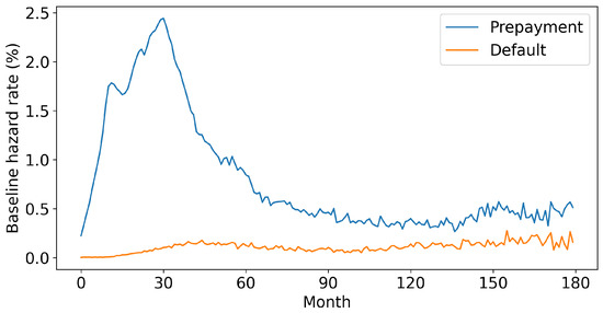 Three different models for are presented in Table 1. While the predictions of default and prepayment probabilities for the linear regression model may fall outside the range , this limitation is resolved by the subsequent use of the multinomial logistic model (Calhoun and Deng 2002). Additionally, the proportional hazard model incorporates the baseline hazard functions , which capture the time-dependent structure of the baseline risk for each event j at the time period k.