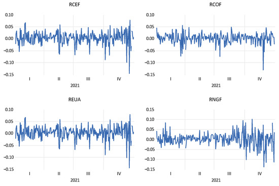 Table 5 shows maximum profit and loss and VaR95, VaR99, CVaR95, and CVaR99 results for the variables. Regarding risk, RNGF stands out with the highest standard deviation and the most extreme daily return range, highlighting its relatively volatile nature. RCEF and REUA share identical extremes, while RCOF exhibits the narrowest range, suggesting a more stable profile.