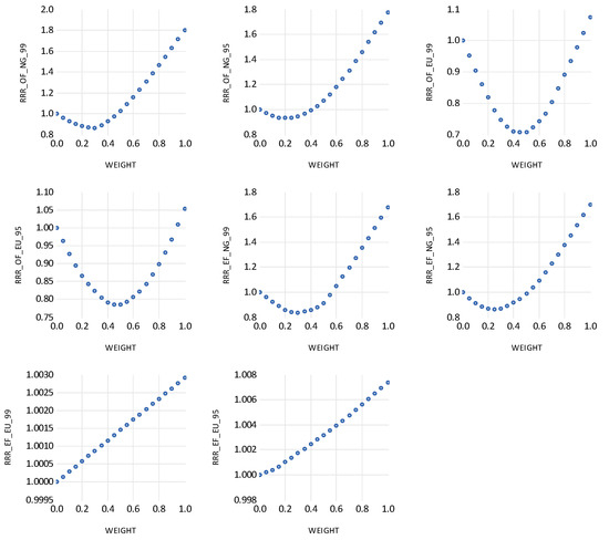Relative risk ratios. Note: RCOF, RCEF, REUA, and RNGF represent crude oil futures, carbon emissions futures, European Union Allowances, and natural gas futures, respectively; for brevity, these variables are abbreviated as OF, EF, EU, and NG, respectively. RRR_OF_NG_99: Relative risk ratio of return of crude oil futures and natural gas futures calculated by CVaR99 of the variables. The RRR_OF_NG_99 graph shows the RNGF weight. RRR_OF_NG_95: Relative risk ratio of return of crude oil futures and natural gas futures calculated by CVaR95 of the variables. The graphs can be interpreted in the same way as these two examples.