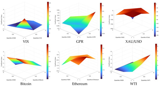 QQR results for the NDX ETF. Note: The surface plots show how the quantiles of the NDX distribution respond to varying quantiles of other financial and commodity market variables. Color gradients reflect the strength and direction of the estimated coefficients.