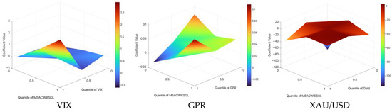 WTI oil prices exhibit a pronounced negative impact, particularly when oil is in the upper quantiles and ESG returns are depressed. This finding is consistent with the structural aversion of ESG funds to fossil fuel exposure and emphasizes the vulnerability of such portfolios to energy price shocks. Natural gas shows a weaker, yet still negative influence, particularly under extreme scenarios, suggesting residual sensitivity to energy market volatility even among sustainability-focused assets.