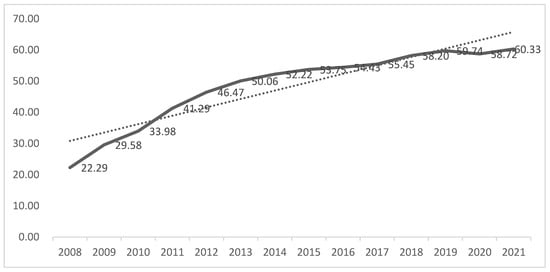 With the continuous advancement of information technology, ERP systems have become indispensable in the field of global business operations. By consolidating both internal and external data flows, ERP systems significantly improve enterprises’ operational efficiency, profitability, and capacity for value creation. In terms of operation, the implementation of an ERP system can effectively improve order delivery speed (Cotteleer and Bendoly 2006), logistics and support (Dehning et al. 2007), management forecasting quality (Dorantes et al. 2013), coordination ability and task efficiency (Gattiker and Goodhue 2005), and other business processes such as planning and control (Olson et al. 2013). In terms of profitability, ROA, ROE, and ROS (Hendricks et al. 2007) can be effectively increased; In terms of enterprise value, the market shows a positive response and return to the adoption of ERP systems (Ranganathan and Brown 2006). In recent years, there has been a notable increase in the adoption of ERP systems among listed companies in China. As illustrated in Figure 1, the percentage of these companies utilizing ERP systems rose from 22.29% in 2008 to 60.33% by 2021, reflecting a cumulative growth of over 38% across 14 years, with an average annual increase of approximately 2.7%. Accordingly, the government has introduced policy guidelines aimed at encouraging enterprises to undertake ERP implementation initiatives1.