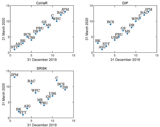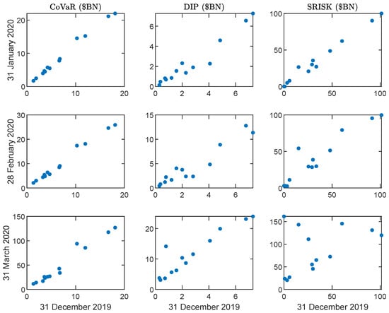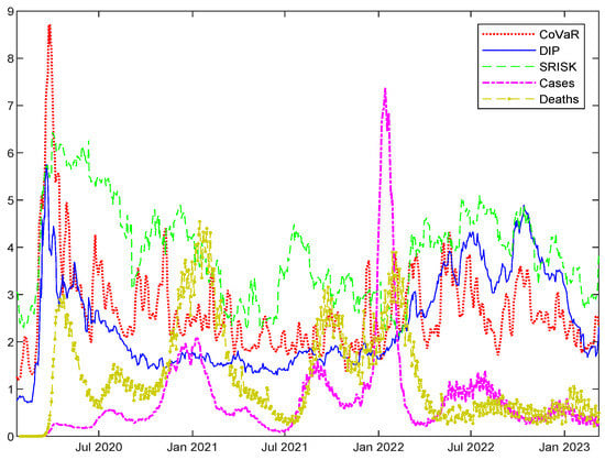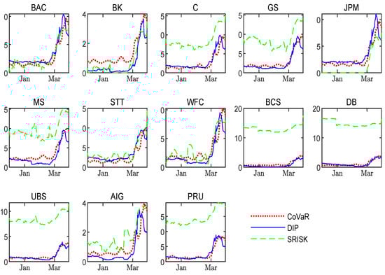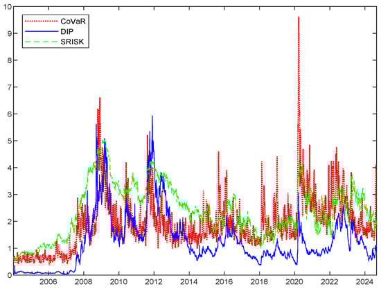 Third, these three measures capture FSR from different angles, complementing each other, thus providing a complete picture of the overall FSR. CoVaR and SRISK are physical measures, while DIP is risk-neutral, including both the physical risk and the risk premium components. Meanwhile, CoVaR and SRISK are conditional concepts, measuring the losses when losses do occur, while DIP is a joint concept, considering both the losses and the probability of loss occurring. Consequently, the magnitude of DIP tends to be smaller than CoVaR or SRISK. The two conditional measures also switch their direction of conditional and main events. CoVaR measures the system’s distress conditional on the distress of each firm, while SRISK is the opposite. Relatively speaking, CoVaR and SRISK mainly rely on stock prices to extract risk information, while DIP mainly relies on credit default swap (CDS) spreads. Thus, the former two lean on the equity side, while the latter one leans on the liability side. As a result, the three SRMs show both similarities and differences, complementing each other in measuring the FSR.