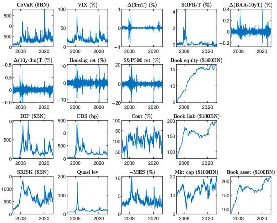 Adrian and Brunnermeier (2016) select seven state variables: VIX (Chicago Board Options Exchange (CBOE) Volatility Index), three-month (3 m) Treasury yield change, 3 m SOFR (Secured Overnight Financing Rate) and Treasury yield spreads, the change in the spread between the BAA-rated corporate bonds and ten-year (10 y) Treasury yield, the change in the 10 y and 3 m Treasury yield spread, the return of the DJUSRE index (the Dow Jones U.S. real estate industry group index), and the equity market return (that is, the S&P 500 index return). They capture different aspects of the financial system that condition the CoVaR measure. For example, the S&P 500 index return and VIX capture the return and volatility of the aggregate equity market, the DJUSRE index represents the housing market, and the spread between the BAA-rated corporate bonds and 10 y Treasury yields proxies corporate credit risk. Adrian and Brunnermeier (2016) originally use the difference between 3 m London Interbank Offered Rate (LIBOR) and the 3 m Treasury bill rate to measure “short-term funding liquidity risk.” As LIBOR is phased out towards the end of our sample period, we replace it with its current counterpart, SOFR, published daily by the Federal Reserve Bank of New York.5