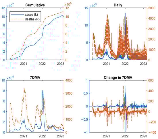 | 11 | The data are available in GitHub at https://github.com/CSSEGISandData/COVID-19/tree/master/csse_covid_19_data/csse_covid_19_time_series (accessed on 12 August 2025). In particular, we download two data files from the website: time_series_covid19_confirmed_US.csv and time_series_covid19_deaths_US.csv. |