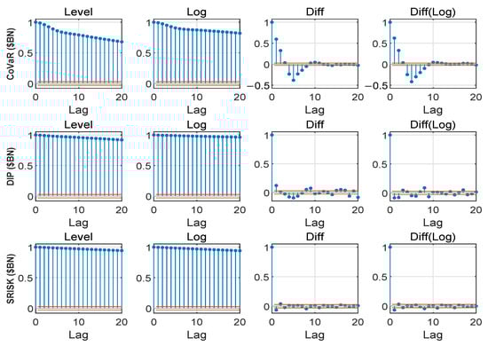 Table 2 shows that the daily SRMs are unit root according to the and KPSS tests, which have better size and power properties than the basic ADF and PP tests. CDS spreads, market capitalization, and book asset are unit root under all test statistics. The first-difference or return type of variables, such as the change in the BAA-rated corporate bonds and 10-year Treasury yield spread ((BAA-10yT)), and the housing and the S&P 500 returns, are stationary. Other financial time series appear bordering stationary and unit root. Panel 2 in Table 2 shows that only the changes of 7DMA COVID-19 variables are stationary, while the cumulative, daily, and 7DMA are not.