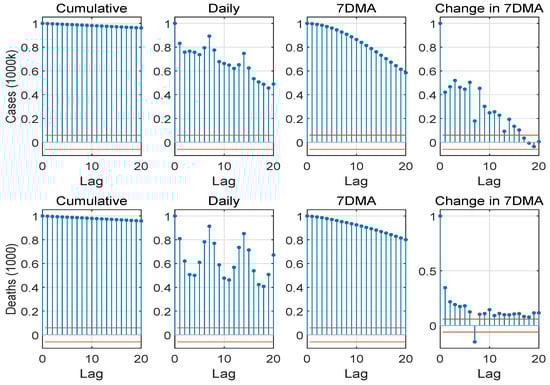 To determine the appropriate time series model for the SRMs and the COVID-19 variables, we first show their time series properties. Figure 5 and Figure 6 plot the first 20 sample autocorrelations of the SRMs and the COVID-19 variables. The SRMs appear persistent, and may be unit root, as the sample autocorrelations remain close to 1 even at lag 20 for the levels and the logarithm of the levels. Their first differences appear to be stationary. The cumulative and the 7DMA COVID-19 numbers are persistent, too. The persistency of daily raw numbers is harder to detect, due to their weekly seasonality. The change in 7DMA appears stationary.