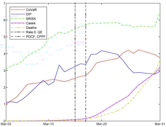 The main findings of this paper include the following. Financial variables, such as CDS spreads, equity correlation, and firm size, significantly affect the SRMs, but the COVID-19 variables do not appear to drive the SRMs over the full pandemic period. However, if we focus on the first wave of the COVID-19 pandemic in March 2020, we find positive and significant COVID-19 effects on two of the three SRMs. This is because the three SRMs initially increased with the daily COVID-19 confirmed cases and deaths but started to level off or decrease after the Federal Reserve introduced policy measures to stabilize the financial system. Thus, the market interventions help to mitigate the COVID-19 effect on the FSR. In the cross-sectional dimension, we find that market capitalization serves as a cushion to a negative shock and helps to reduce a firm’s contribution to the SRMs, while firm size significantly predicts the surge in a firm’s contribution to the SRMs when the pandemic first hits the system.