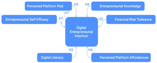 The present study addresses both gaps. We conceptualize digital entrepreneurial intention (DEI) as the outcome of three intertwined forces: individual cognitive capability (entrepreneurial self-efficacy and knowledge), digital-technical capability (literacy and perceived platform affordances), and risk posture (financial risk tolerance and perceived platform risk). By integrating TPB, Risk-Taking Theory, and Affordance Theory, we propose that stronger self-efficacy, higher risk tolerance, greater digital literacy, richer perceptions of platform affordances, and deeper entrepreneurial knowledge each propel DEI, whereas heightened platform risk dampens it. Moreover, we argue that PPR conditions the power of self-efficacy: when perceived risk is high, even confident entrepreneurs hesitate.