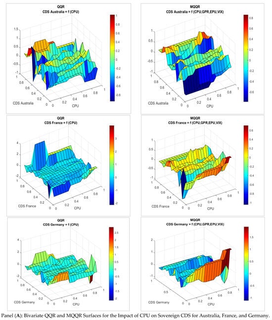 Across the sample of advanced and emerging economies, the relationship between CPU and sovereign CDS exhibits substantial nonlinearity and state dependence. In Australia, the CPU has asymmetric effects, exerting a negative or muted influence under stable credit conditions but significantly amplifying sovereign risk in high CDS regimes. This sensitivity persists, though it diminishes, once broader global risk factors (GPR, EPU, VIX) are controlled for. France similarly displays intensified responsiveness to CPU during joint stress states, with positive effects concentrated in the upper quantiles of both CPU and CDS. At the same time, more neutral or negative responses prevail during periods of low risk. Germany’s exposure is more conditional, with CPU increasing CDS spreads primarily in tranquil regimes, and only jointly contributing to risk when global uncertainties are elevated. Japan exhibits sharp nonlinearity, where mild CPU shocks can drive substantial CDS spikes during stress, yet moderate CPU is often associated with risk reduction, likely reflecting policy credibility. These dynamics are reinforced but more focused when controlling global risk factors. South Korea exhibits limited standalone sensitivity to CPU in stable periods, while significant positive effects emerge only under simultaneous spikes in CPU and CDS, especially when global risks are considered. In the United Kingdom, CPU consistently exerts adverse or negligible effects on sovereign spreads across most quantiles, implying resilience or institutional confidence, with only mild risk amplification observed under severe global stress. The United States presents a more systemic profile: CPU has limited impact under normal conditions but generates robust and consistent positive spillovers on CDS during joint tail events, reflecting its centrality in transmitting global climate-financial risks. Brazil’s CDS spreads increase in response to moderate CPU even under calm markets. However, stronger climate shocks under stress have a subdued or negative effect, possibly due to policy offsets or external buffers. Multivariate results confirm that global factors often dilute CPU’s role, except under specific stress regimes. Indonesia’s sovereign risk rises moderately in low-risk environments but declines in relevance during high-stress states, as global uncertainties dominate, as highlighted by the dampened CPU effects in the MQQR framework. Finally, South Africa demonstrates sensitivity to CPU mainly in lower CDS quantiles, suggesting that climate uncertainty elevates perceived risk under stable conditions but becomes less impactful when systemic volatility prevails. MQQR further shows that global factors absorb a significant portion of the CPU’s explanatory power. Collectively, these findings underscore the nonlinear, regime-specific nature of CPU’s influence on sovereign credit risk, with advanced economies generally showing more structured responses and emerging markets displaying more heterogeneous, state-contingent effects.