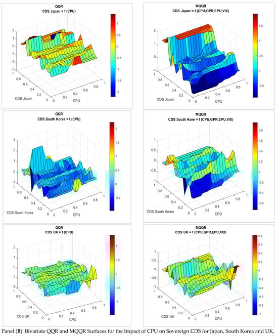 To address potential omitted variable bias and capture the joint influence of global uncertainty on sovereign credit risk, we extend the univariate QQR framework by employing the MQQR approach. This methodology enables us to investigate how the effect of CPU on sovereign CDS spreads varies across different market states, while simultaneously controlling for major global risk factors. Figure 1 illustrates the nonlinear and state-dependent relationship between CPU and sovereign CDS spreads across all countries in the sample. Each country-specific panel presents the bivariate QQR surface on the left, capturing the partial effect of CPU across varying quantiles of both CPU and CDS without accounting for other risk drivers. The right panel in each country plot displays the MQQR surface, which incorporates additional global risk factors to isolate the marginal impact of CPU.