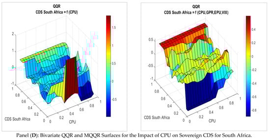 These cross-country dynamics align with and extend insights from recent literature on sovereign risk under uncertainty. In particular,  () demonstrate that the effect of CPU on sovereign borrowing costs is more pronounced in less developed economies, where lower resilience and greater climate vulnerability amplify credit risk, which aligns with our findings for Brazil, Indonesia, and South Africa. Conversely, in advanced economies, where fiscal space and institutional strength often buffer external shocks,  () and  () demonstrate that the pricing of climate risk becomes more conditional, materializing predominantly during periods of elevated stress. This mirrors our observation that the CPU significantly influences CDS spreads in developed countries, primarily in the upper quantiles, i.e., high-risk regimes. Additionally, the dilution of the CPU’s standalone role once global uncertainties are controlled for (MQQR results) is consistent with  () and  (), who find that global risk indicators, such as the VIX, substantially drive sovereign spreads, especially in emerging markets. More broadly, our findings align with  (), who emphasizes that climate uncertainty-induced spillovers are highly contingent on country integration and regime type, with more integrated markets exhibiting stronger co-movement in response to global shocks. This study contributes to a growing body of evidence that sovereign credit risk under climate uncertainty is nonlinear, context-dependent, and moderated by both macro-financial resilience and exposure to global volatility.