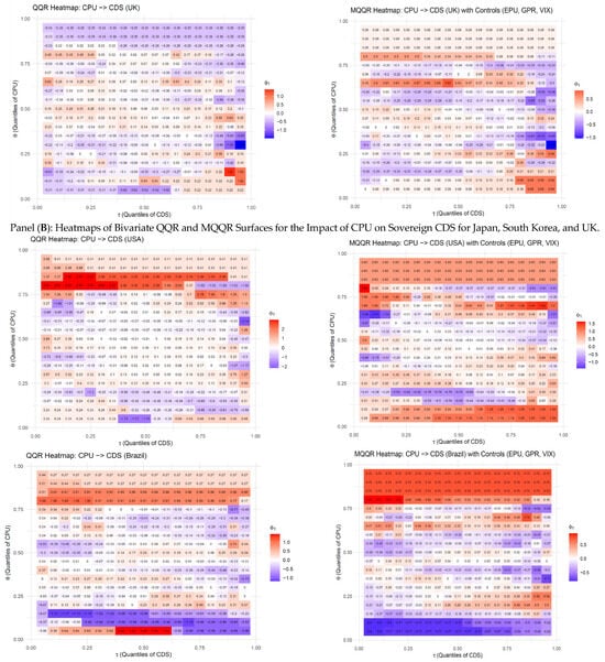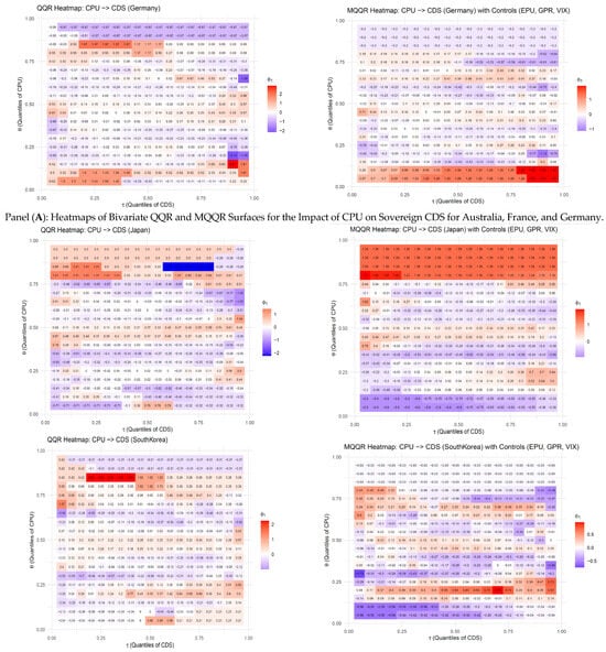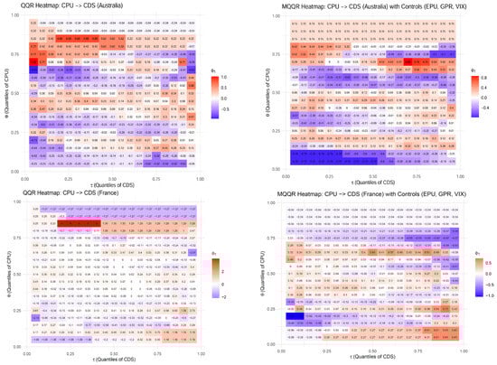 To enhance the interpretability and transparency of the results, we have supplemented the three-dimensional surface plots in Figure 1 with two-dimensional heatmaps presented in Figure 2. While Figure 1 illustrates the nonlinear and state-dependent relationship between CPU and sovereign CDS spreads for each country, both in the bivariate QQR specification (left panel) and in the MQQR specification with global risk controls (right panel), these plots alone make it difficult for the reader to gauge the precise magnitude and direction of the estimated partial effects. Figure 2 addresses this limitation by displaying the estimated ϕ1 coefficients across all (θ,τ) combinations in a heatmap format, incorporating numerical coefficient values.