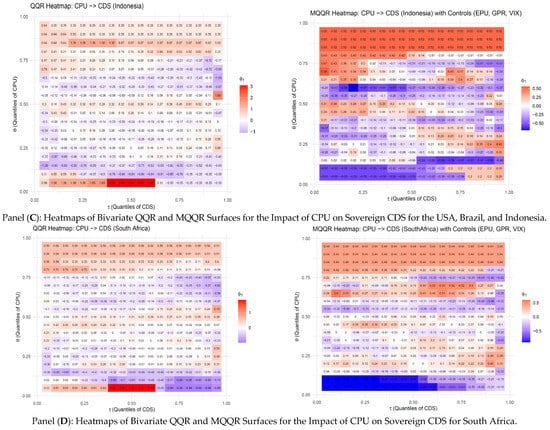In South Korea, CPU generates strong positive effects in elevated uncertainty states but negative ones under low CPU–high CDS conditions, with the MQQR results revealing a more balanced influence that persists mainly in high-uncertainty regimes. The UK shows relatively weak and often negative standalone effects, yet once global risks are controlled for, CPU’s positive role in driving sovereign risk becomes clearer, especially under high CPU conditions. In the U.S., CPU has strongly asymmetric standalone impacts, sharply raising risk in tranquil credit conditions while easing pressures under stress; with controls, these effects moderate but remain consistently positive in elevated uncertainty states. Emerging markets show similar conditional dynamics: in Brazil, CPU amplifies risk in stable markets and eases it in stressed ones, with the MQQR results confirming a persistent but more moderate influence; in Indonesia, CPU shocks produce both amplifying and dampening effects depending on prevailing market conditions, though after accounting for global risks, positive effects dominate at high CPU levels. Finally, in South Africa, CPU strongly raises risk in calmer conditions but reduces it under stress, with global factors tempering but not eliminating its independent effect, highlighting the nonlinear and conditional role of climate policy uncertainty across different sovereign credit environments.