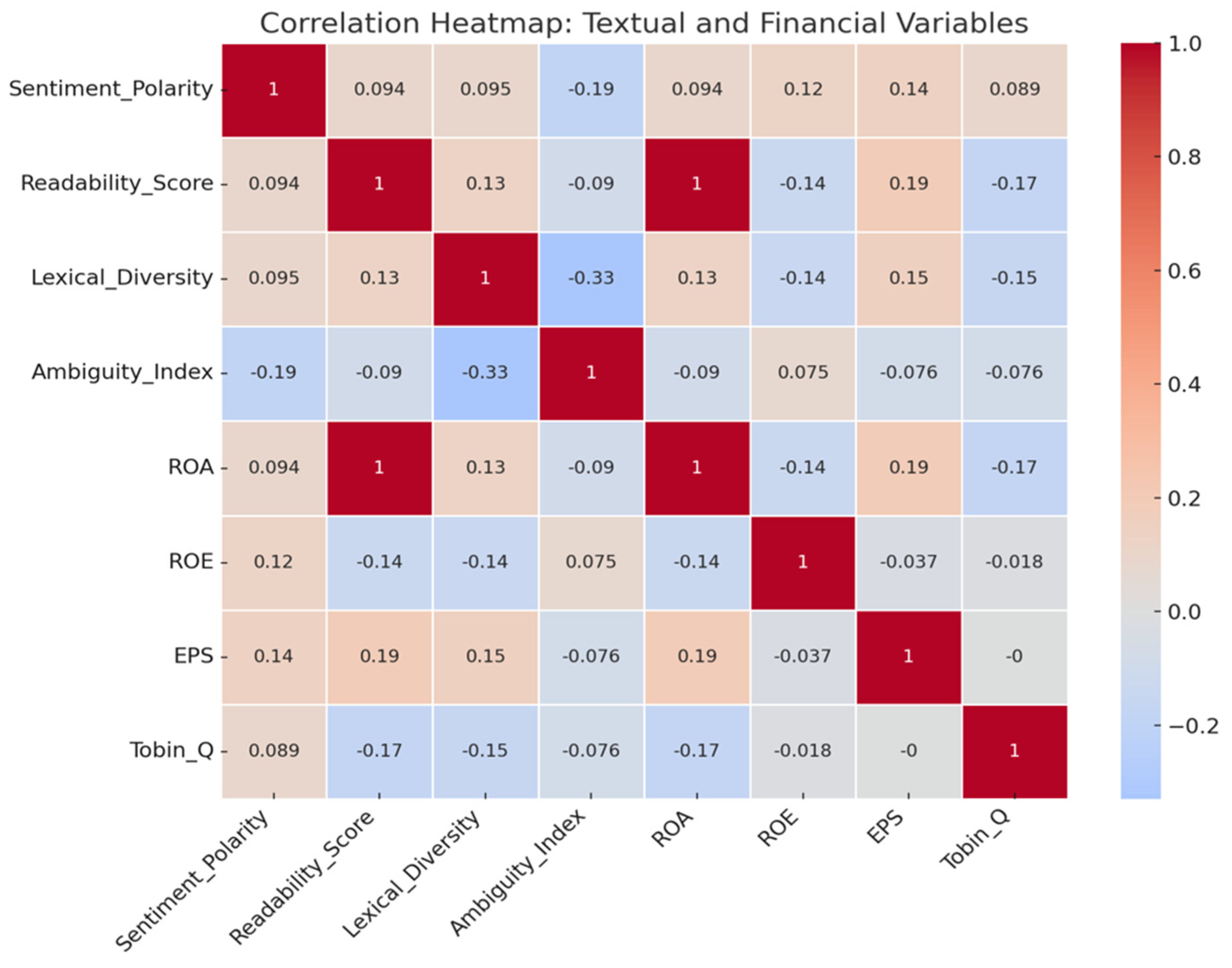 Ambiguity index has a negative relationship with a number of the financial metrics including EPS (r = −0.076) and Tobin’s Q (r = −0.076), suggesting that vagueness in language may serve to erode market confidence. It is also interesting to note that lexical diversity has a negative relationship with ambiguity (r = −0.330), suggesting that more varied vocabulary supports the precision of language used.